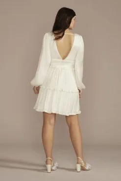 Ruffled Charmeuse V-Neck Long Sleeve Mini Dress