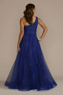 One-Shoulder Glitter Tulle 3D Floral Ball Gown