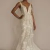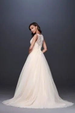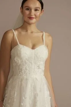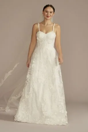 Dripping with 3D floral appliques, this corset bodice wedding dress is something of a dream. The full A-line skirt is perfect for moving, grooving, and schmoozing with your wedding guests.