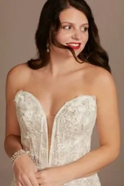 Whether it’s worn with just one shoulder, both straps or strapless, this sequin-strewn sheath wedding dress is perfect for the bride looking for versatility. Over 4,000 beads and six different shapes of floral appliques cover the dress, from the plunging neckline to the chapel train. A powermesh bodysuit sits beneath the romantic, semi-sheer lace layers for a sexy look that provides comfortable smoothing all day and night.