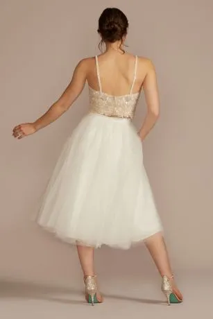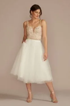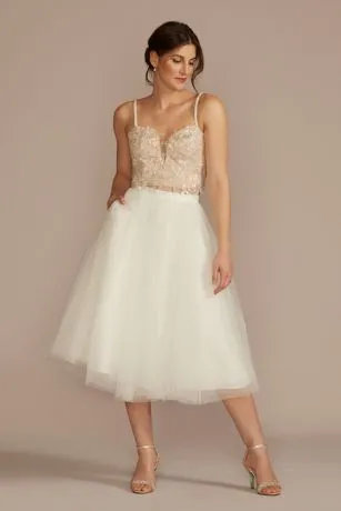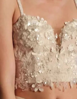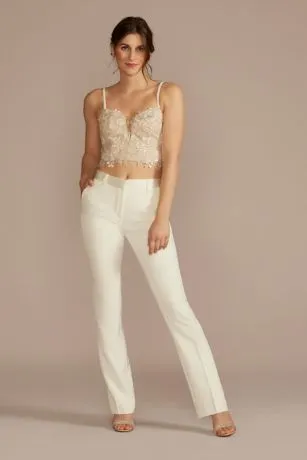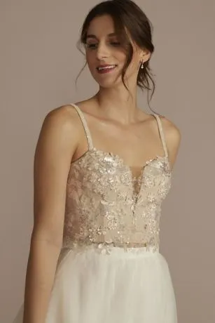 It’s your time to sparkle! Add some romance with 3D appliqued flowers, beaded applique straps, and an alluring sweetheart neckline. Pair this dazzling bridal top with a smart suit or a twirlable tulle skirt to create your perfect bridal vibe.