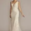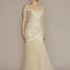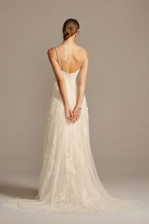 Appliqued with pearl-centered blush flowers, this scalloped-bodice gown has an irresistibly ethereal feel. The tulle skirt is softly voluminous, and the double-strapped, low back lends a delicate feel.