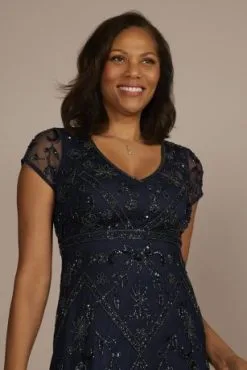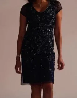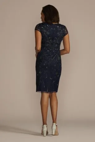 Mom needs no help lighting up a room, but this mesmerizing beaded dress will add to her sparkle! Countless swirls, lines, and floral patterns detail the short sheath silhouette and illusion cap sleeves beautifully.