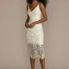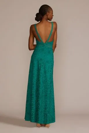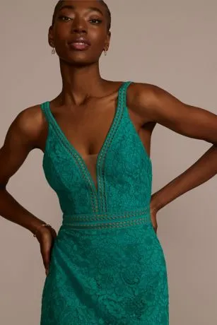 Sleek, sexy, and stunning, this elegant formal dress has it all. Delicate lace fabric is a marvel to look at, but the perforated detailing around the waist and plunge neckline steals the show.