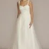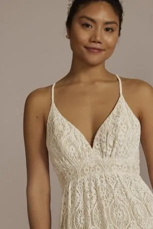 Inspire awe as you walk down the aisle in this ethereal lace gown. A scalloped hem adorns the A-line skirt, creating mystical movement with every step. The squared open-back detail is an exciting addition to an otherwise whimsical silhouette, ensuring all eyes on you.