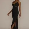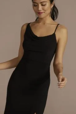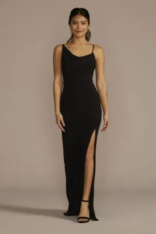 Meet your new go-to going-out look! This sleek sheath dress is designed with body-hugging jersey fabric, a flirty skirt slit, and an modern asymmetrical cowl neckline.