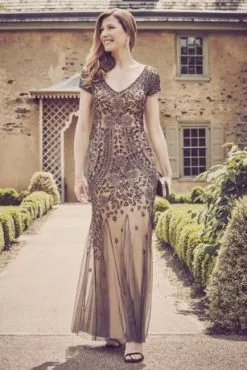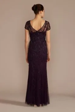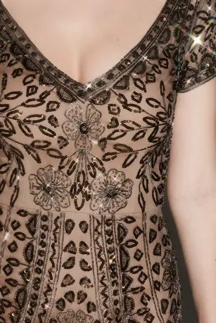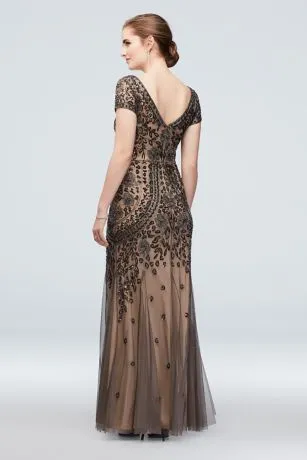 A modern take on Roaring 20s sophistication, this intricately beaded, short sleeve mesh gown shimmers and shines with light-catching geometric patterns. Dazzling flowers with sparkling petals float down to delicate chiffon godets at the hemline.
