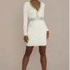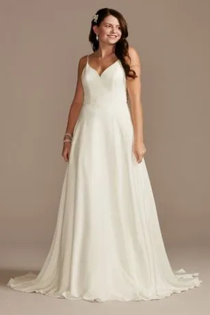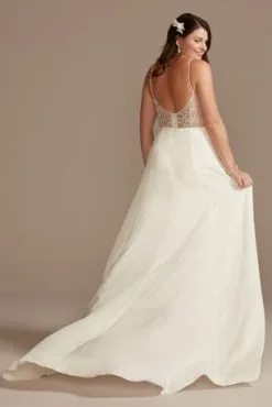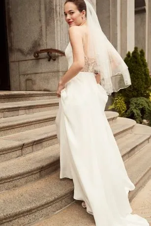 Make a statement while walking down the aisle in this crepe-back satin wedding dress. Unadorned in the front, the dramatic illusion back is embellished with delicate flowers and accented with over 1,500 opals, crystals, and beads.