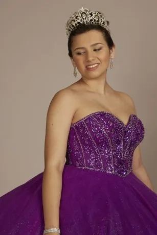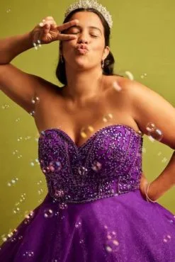 A stunning example of artistry, it took 40 hours to hand-place the 12,000 beads on this dazzling quince ball gown. The embellished, corset-like bodice sits atop a full ball gown skirt, and comes complete with a removable bolero to switch up your look.