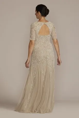 Showcasing once-in-a-lifetime extravagance, this gown is beautifully beaded with opulent details through the bodice and finished with a godet skirt.