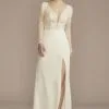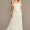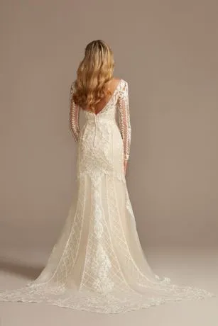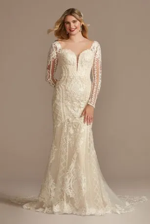 This curve-hugging, layered lace wedding dress is beautifully detailed with a plunging sweetheart neckline, flattering princess seams, and allover intricate beadwork and sequins. Complete with a beautiful scalloped chapel train.
