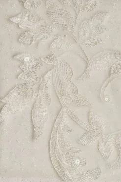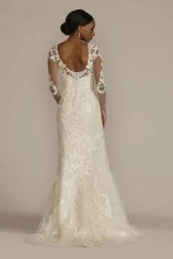 This beaded sheath wedding dress is brought to life with a removable overskirt. Illusion sleeves decorated with hand-placed lace appliques will enhance your bridal elegance alongside an open back detail.