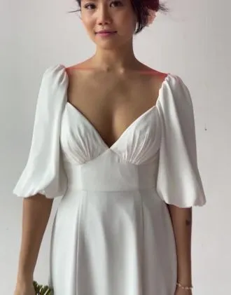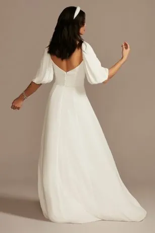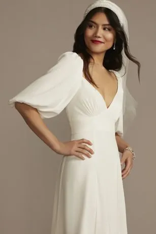 Perfect for the boho bride, this V-neck wedding dress is crafted of georgette, which feels soft against the skin and drapes elegantly on the body. Bubble sleeves and an empire waist lend the gown fun, carefree details.