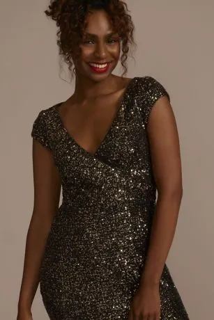 If you’re looking to add some shine to your next special event, this gorgeous cap sleeve dress is a fresh option. Covered in head-to-toe sequins and complete with a skirt slit, this faux-wrap sheath dress knows how to make an entrance.
