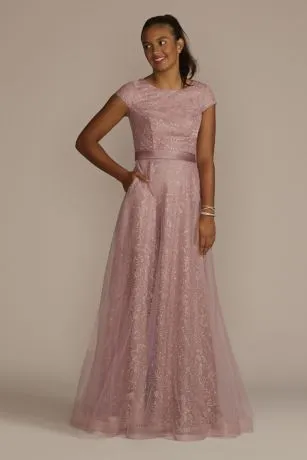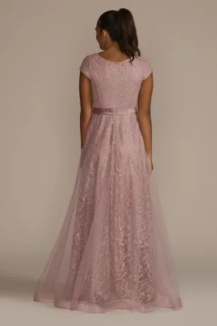 Combining major romantic details, this sweet cap sleeve A-line dress is fit for a prom princess. A sequin floral pattern covers the bodice and full tulle skirt for beauty that glitters as it glides. The satin waist detail ties the whole look together.