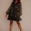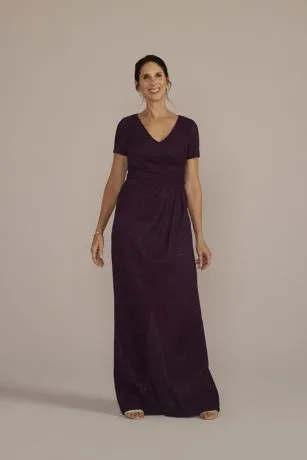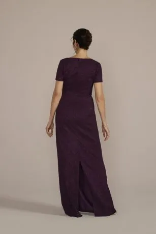 This floor-length gown bridges the gap between modern and timeless. An opulent glitter knit fabric provides shine to the classic sheath silhouette, and a slit adds a chic, unexpected touch.