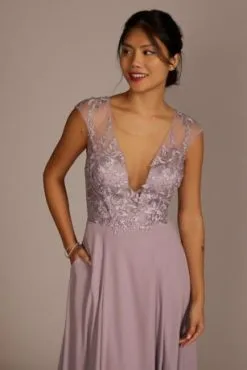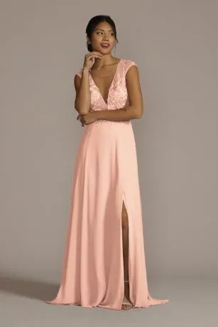 Ready to make a statement? This sexy bridesmaid dress is full of glam details including illusion cap sleeves, a plunging illusion bodice with sequins, a keyhole back, and a full georgette skirt with slit. Features side pockets.