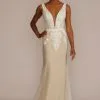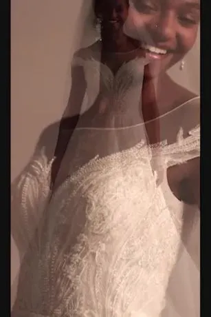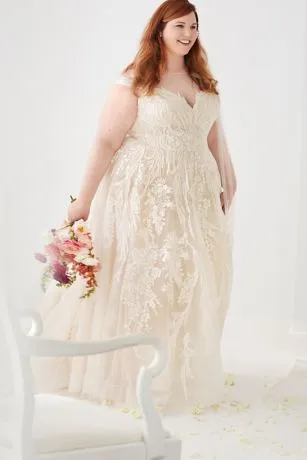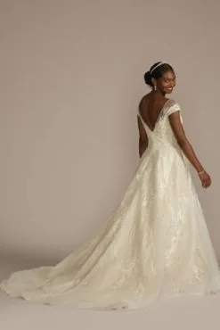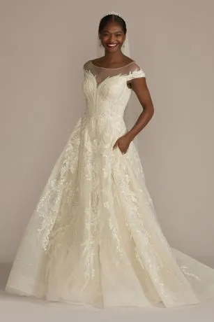 An illusion neckline, pretty cap sleeves, and a low V-back adorn the fitted bodice of this romantic wedding dress. On the glorious ball gown skirt, beaded lace appliques add texture and shine.