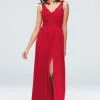 Simple yet sexy, this satin-like charmeuse bridesmaid dress delivers all kinds of glamour with a plunging neckline, spaghetti straps, and an envelope skirt featuring pockets.