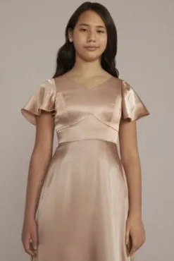 A sweet look that’ll fit right in with the bridesmaids, this satin-like charmeuse junior bridesmaid dress features a V-neckline, graceful A-line skirt, and flutter sleeves.