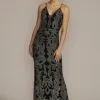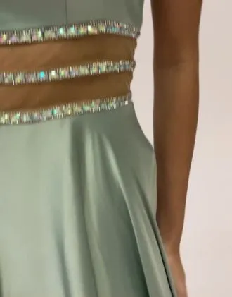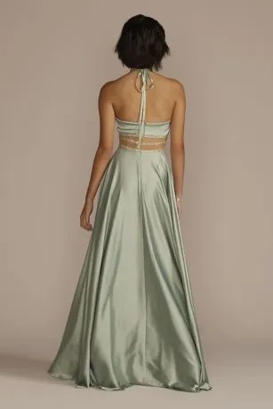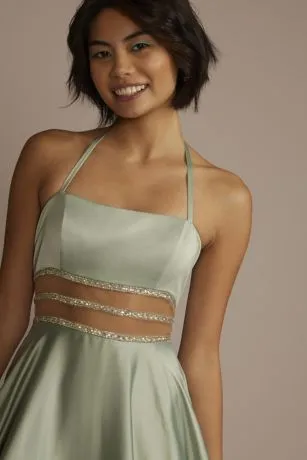 The illusion bodice lined with beaded crystals isn’t the only thing that shines on this prom-perfect dress. Satin-like charmeuse fabric catches the light for a regal appearance, while the straight neckline adds a modern touch.