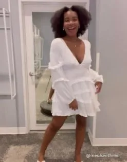 Perfect for any wedding event or a warm-weather honeymoon, this billowy little white dress exudes boho vibes with its sweet ruffle accents, whimsical balloon sleeves, and sexy keyhole tie at the back.