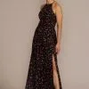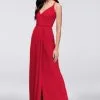 This glamorous long bridesmaid dress makes a statement with satin-like charmeuse fabric, a V-neckline, triangle waist, and full envelope skirt with slit.