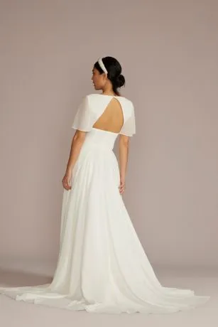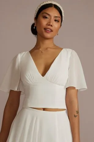 The best bridal looks are the ones you can make totally unique (and re-wear after the ceremony)! This flutter sleeve V-neck bridal top pairs well with your favorite separates skirt or pants for a perfectly picturesque look.