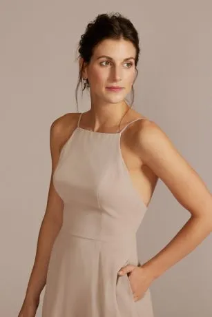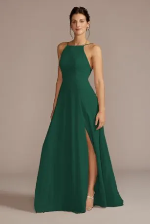 There’s so much to love about this chiffon bridesmaid dress, from the high neckline to the A-line skirt with pockets and a slit.