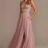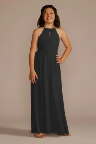 Graceful pleating and a high neckline add elegance to this long junior bridesmaid dress. A pleated panel at the waist completes the look.