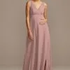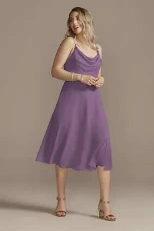 A modern midi bridesmaid dress with a trendy cowl neckline. The skirt slit adds a flirty touch.
