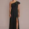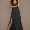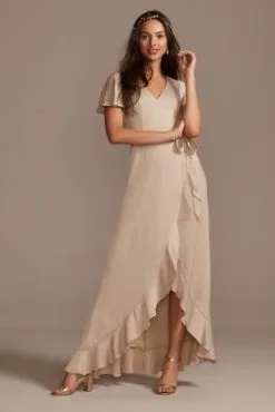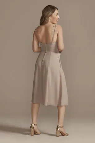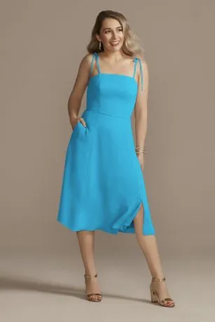 A modern midi bridesmaid dress with spaghetti straps that tie for the perfect fit. A skirt slit adds a flirty touch.