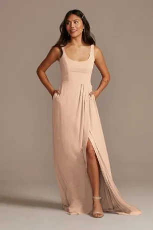 A simple front makes way for a statement back! This scoop-neck chiffon bridesmaid dress ties in the back, creating pretty drama. Features side pockets.