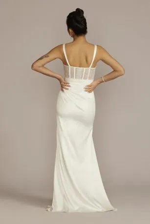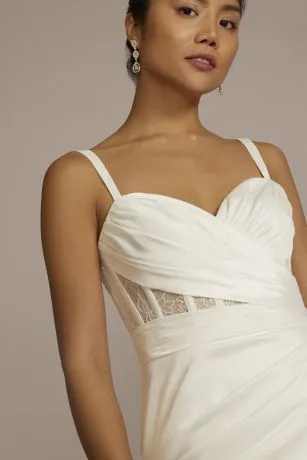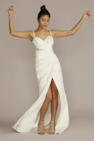 Hearts will race at the first sight of this hand-pleated sheath wedding gown. A sexy sheer lace bodice with corset boning turns up the heat alongside a dramatic skirt slit, all balanced by a sweetheart neckline and waist gathering. Comfort is key with stretch satin fabric, perfect for dancing all night long.