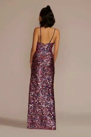 Why blend in when you can stand out in something fabulous?! This cowl neck sheath dress brings the shimmer and shine with allover colorful sequins for the ultimate prom look. A side slit adds a flirty detail.