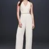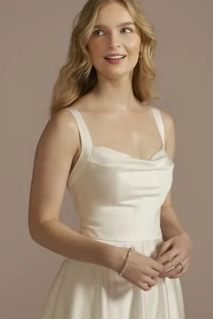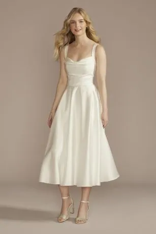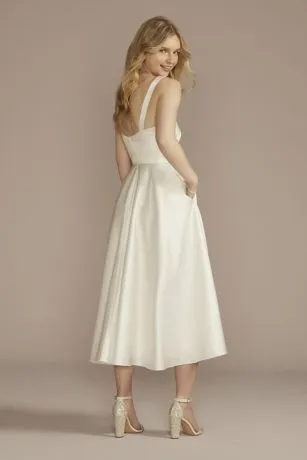 You’ll fancy yourself a modern-day siren in this satin A-line beauty. The tea-length skirt can’t wait to be twirled from one pre-wedding event to the next while the low back invites all eyes to you.