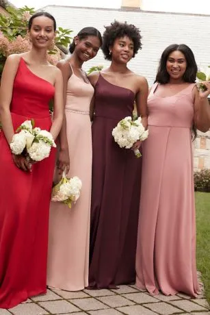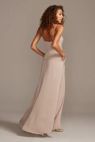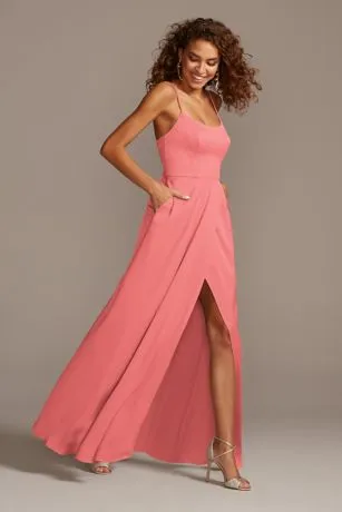 Radiate glamour in this clean-lined, crepe-back satin bridesmaid dress with a modern scoop neckline, flattering bodice seams, a sleek overlay, and a sexy skirt slit. The adjustable straps provide a perfect fit and handy side pockets are an easy place to keep lip gloss or emergency bobby pins.