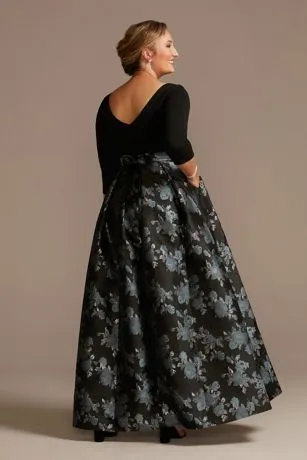 A sweeping floral skirt steals the show on this elegant ball gown, making it a sophisticated and chic choice for any mother of the bride or groom.