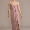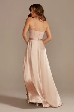 The matte crepe corset bodice on this long bridesmaid dress beautifully contrasts the satin-like charmeuse envelope skirt with pockets. Features adjustable straps.