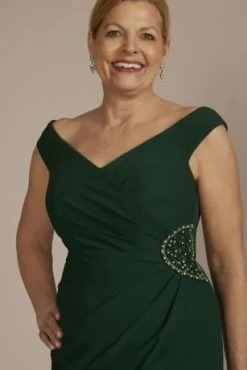 An off-the-shoulder sweetheart neckline shapes this modern look for mom. Crepe knit fabric gathers at the waist to reveal an embellished detail, highlighting your curves.