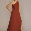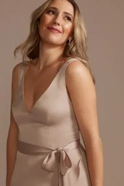 Crafted of crepe-back satin, this high-low bridesmaid dress shines from the tank V-neckline to the ruffled skirt hem. A tie sash at the waist adds the finishing touch.