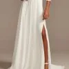 This sleek and simple wedding dress is crafted of comfortable stretch crepe with a powermesh lining, allowing for a close fit with built-in support. The dress features elongating seams down the bodice and flowing godets through the sweep train, creating graceful trumpet skirt.