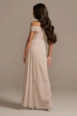 This mesh junior bridesmaid dress features off the shoulder sleeves that create a ruched crisscross bodice. Spaghetti straps complete the look.