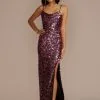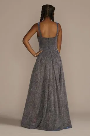 This iridescent ball gown’s metallic fabric reflects your impeccable prom style. A timeless silhouette becomes so youthful thanks to a sexy crisscross detail on the plunge neckline.