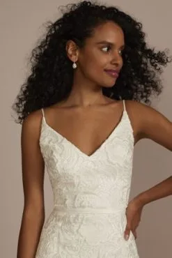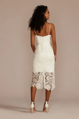 This lace crochet v-neckline midi will fill any of your little white dress needs, from your bridal shower to your after party. The textured lace overlay, accented with thick embroidery that outlines the lace’s swirls and blooms, features a charming illusion hemline.