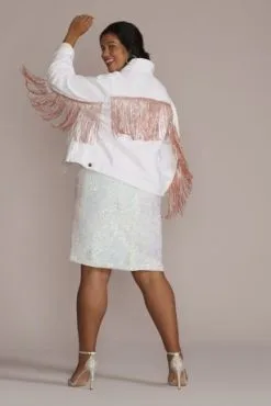 In collaboration with DanielXDiamond, this one-of-a-kind rose gold and white denim rhinestone fringe jacket demands the spotlight whether you’re celebrating a birthday, wedding, or just a night out! Make it completely your own with the included embroidered iron-on “PARTY” and “BRIDE” patches.