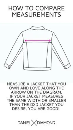 Inclusive of all gender identities, DanielXDiamond uses unisex sizing. When selecting your size, please compare the back seam measurement of a jacket you already own and love to the size chart provided. Reference the diagram included for assistance.