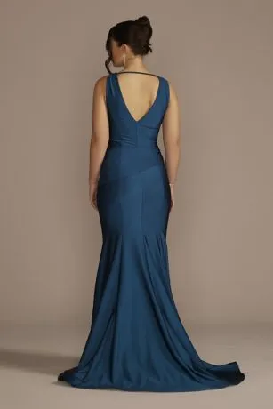 Serve elevated elegance in this sleek mermaid dress designed with stretch satin to highlight and hug your figure. Memorable details like the draped bodice, sexy open back, and dramatic train ensure all eyes will be on you.