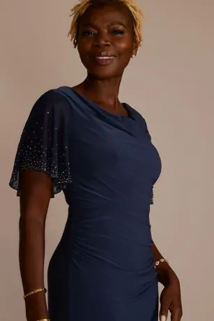 Elegant is an understatement for this cowl neck jersey sheath that hugs your silhouette just right. Embellishments on the short flutter sleeves add sparkle to complement your favorite accessories.