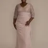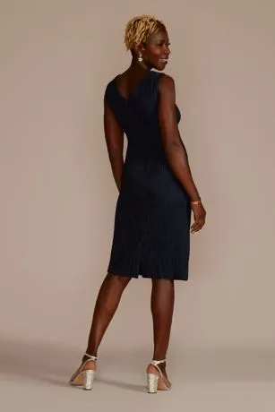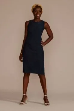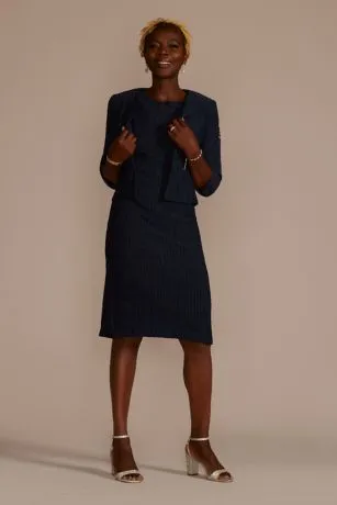 Sparkling sequins detail the illusion sleeves of a cropped knit jacket, perfectly matching the sheath dress’ scoop neckline. An elegant choice for any mother of the bride or groom.